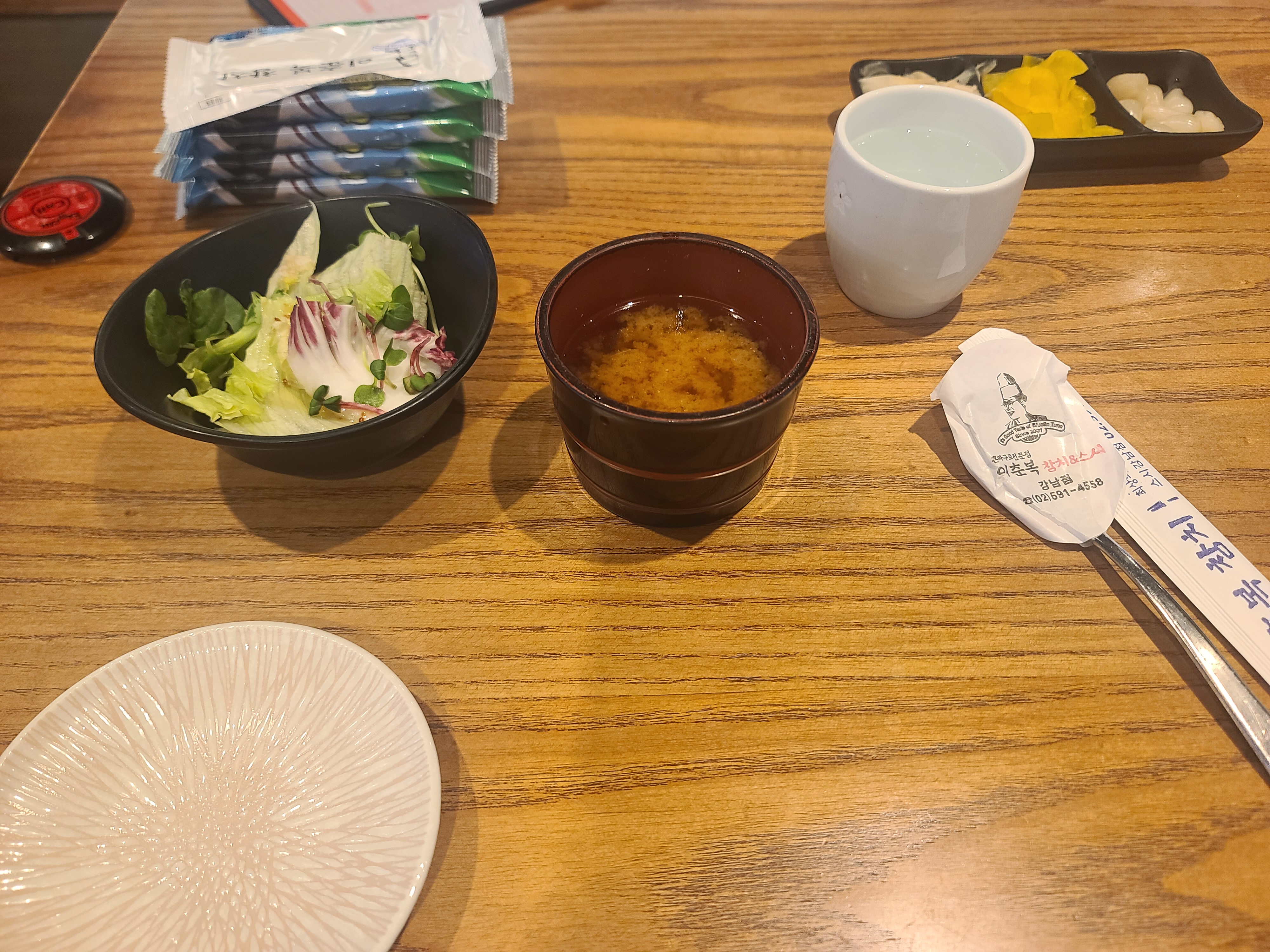 기본 세팅으로 김과 샐러드와 맑은 국이 나옵니다 앞접시도 있고요.